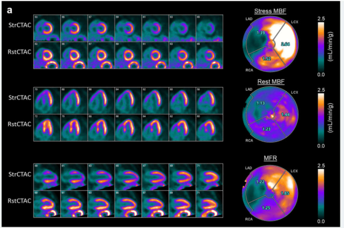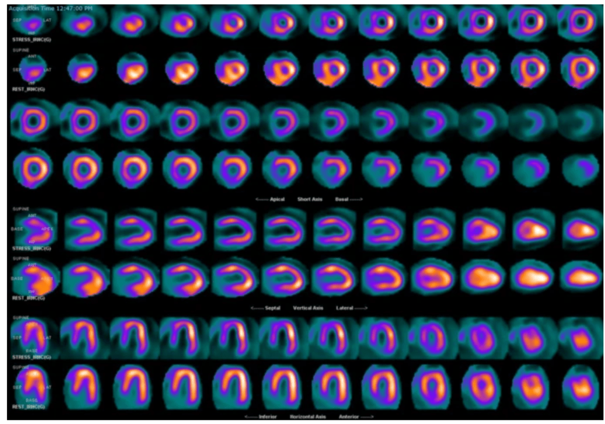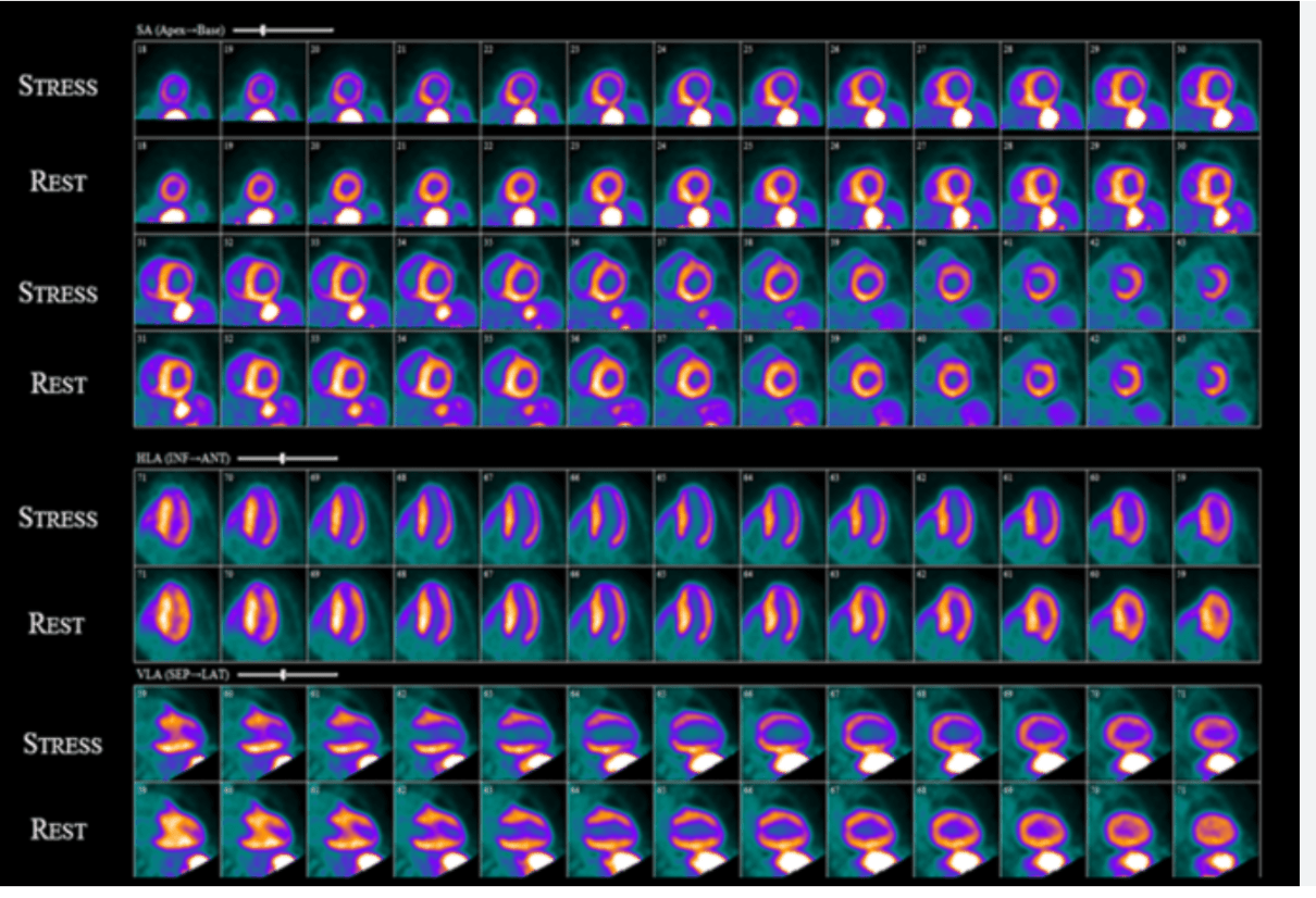 Images showing a small (< 10%) fixed perfusion defect at the apex, moderate (10-20%) ischemia in the territory of the LAD, and mild (< 10%) ischemia in the territory of the LCx. Most striking is the presence of TID with a ratio of 1.41.