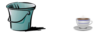 Which can hold more water? The bucket or the coffee mug? En espanol: ¿Cuál puede contener más agua? ¿El cubo o la taza de café?