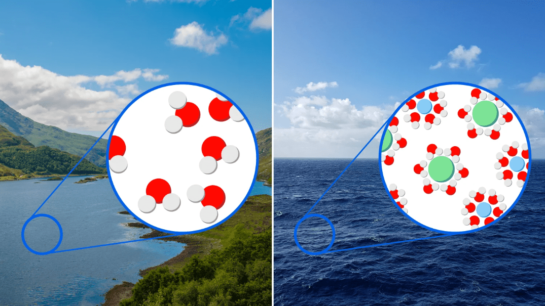 El agua dulce contiene sólo moléculas de agua, mientras que el agua salada contiene átomos de sodio y cloro rodeados de moléculas de agua.