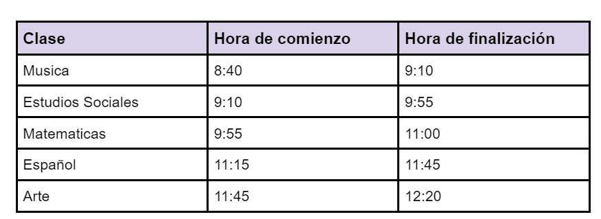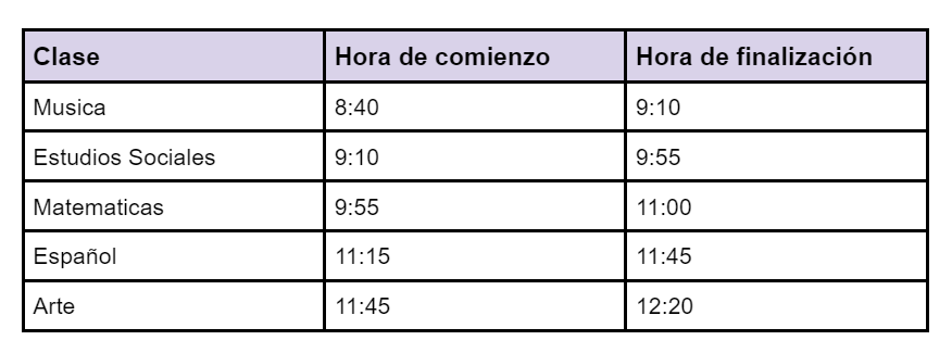 ¿Cuanto tiempo hay entre la final de la clase de matematicas y la clase de español?