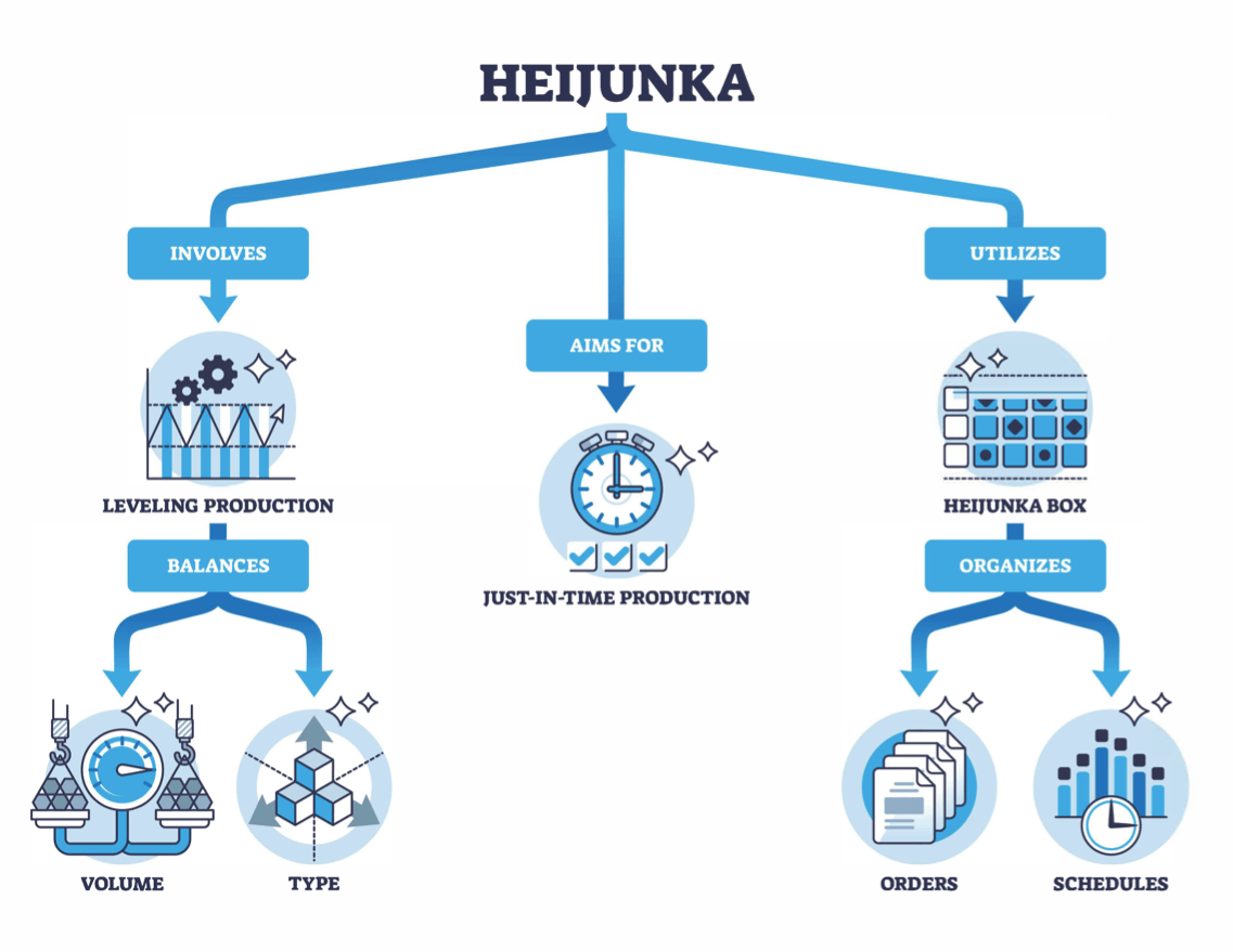 Japanese term for leveling or smoothing the production schedule, achieved by averaging out both the volume and mix of products throughout the production line.This method enables the operation to adapt promptly to fluctuations in customer demand, by evenly producing various kinds of products each day in a small amount.