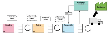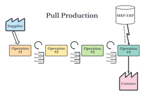 Any item that exists the supermarket signals the need for production or delivery. In a Supermarket Pull System, the segment at the end of a process contains a supermarket that holds an amount of each item it produces. Once the downstream process retrieves the items, the upstream process then produces to replenish what is withdrawn from its supermarket. This is often communicated by using kanban cards.