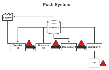 Mass production technique in which batched orders are pushed from a central production authority based on a pre-determined schedule, whether or not the customer placed an order or if the downstream operation is ready for it.