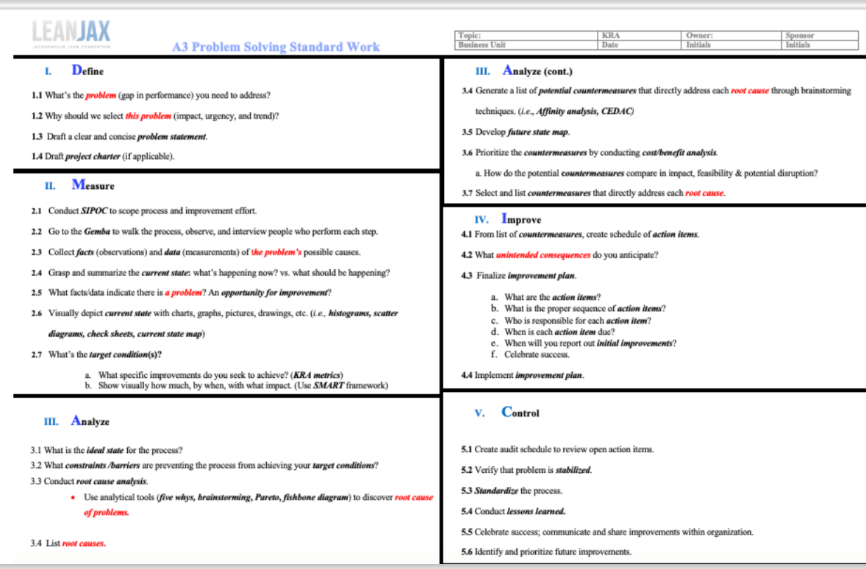 2. Provides standard work process for a root cause analysis based problem solving approach.