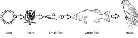 A pond food chain is illustrated here. In this food chain, the large fish gets its energy by