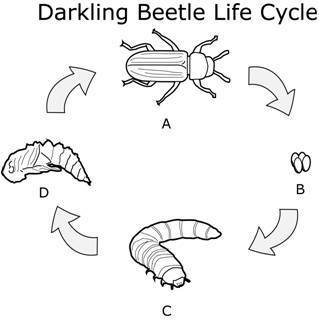 The life cycle of a darkling beetle is shown here. Which stage represents the change from larva to adult? A, B, C, or D?