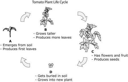 This diagram illustrates the life cycle of a tomato plant. Which stage in this plant life cycle is the adult? A, B, C, or D