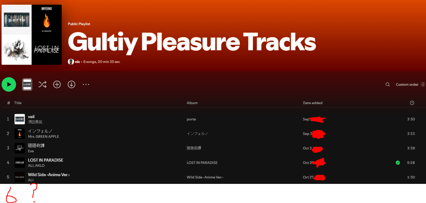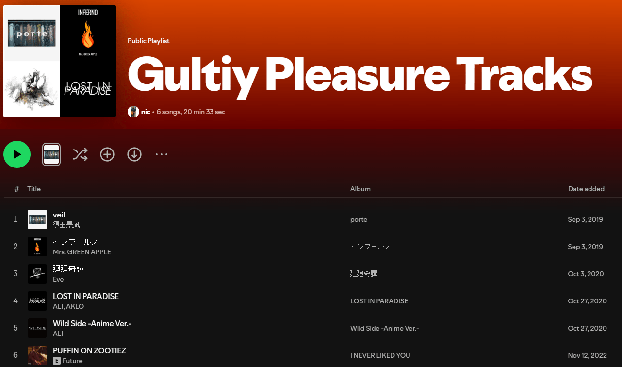 Your playlist "Guilty Pleasure Tracks features 5 J-Rock/Pop songs and a 6th song from the rapper Future