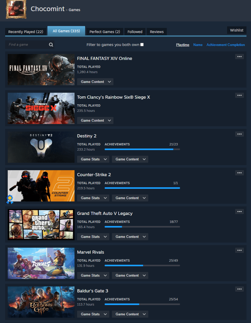 What is your second most played game on Steam (FF 14 is by far #1 with 1.2k hours)