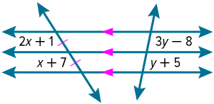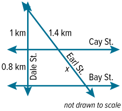 In Mika’s town, Cay Street and Bay Street are parallel. Find the value of x, the distance from Cay Street to Bay Street along Earl Street.