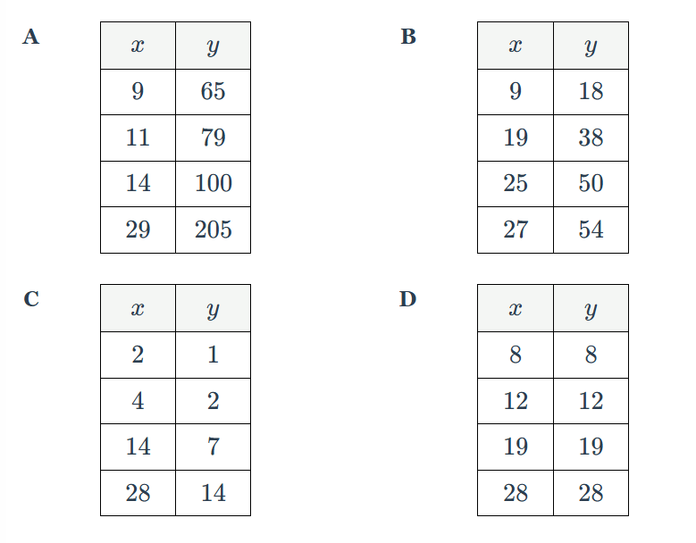 Which table does not show a proportional relationship between x and y?
