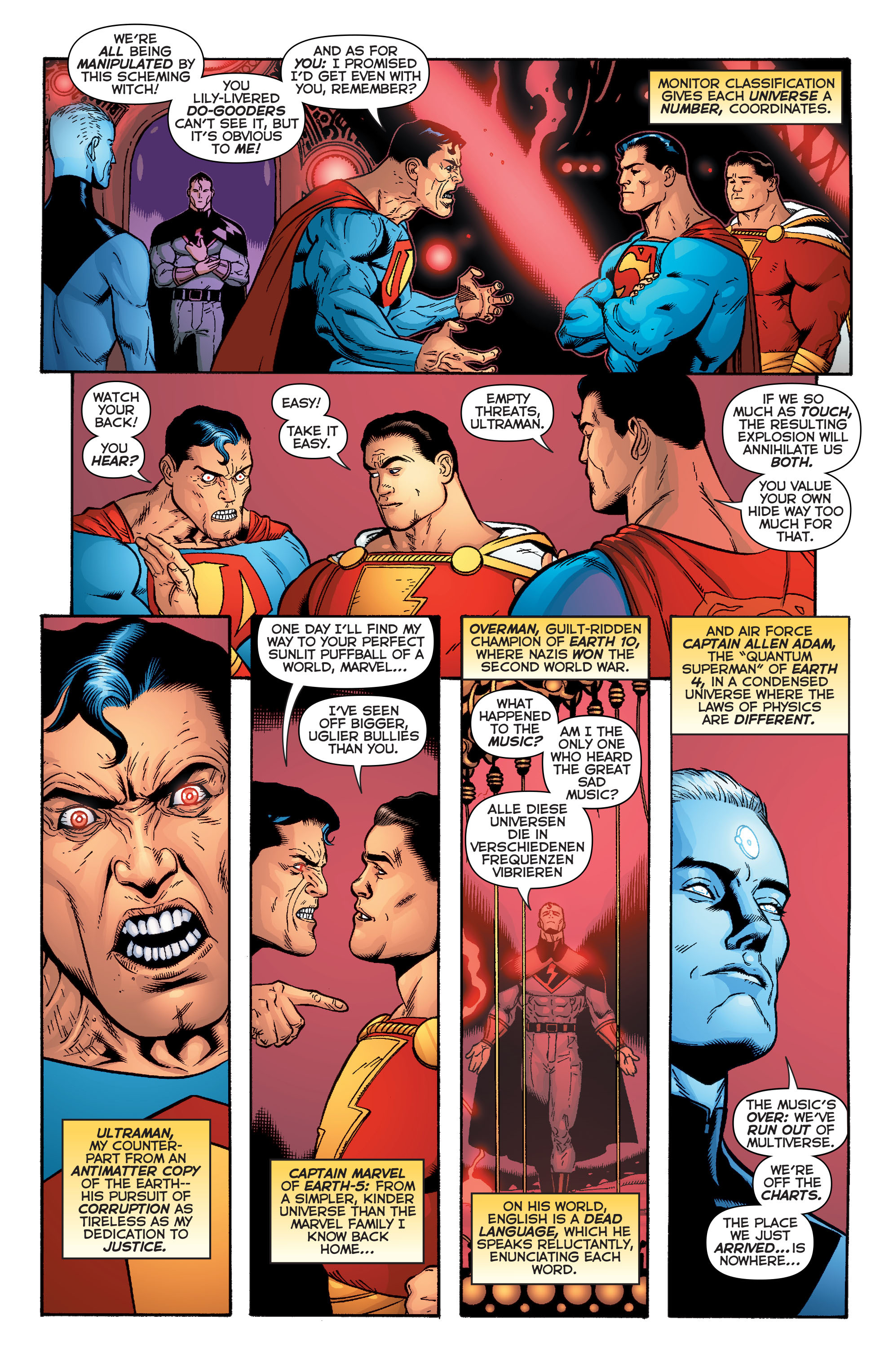Earth 2 Superman blames New Earth Superman for Lois of Earth two's death and attacks him.