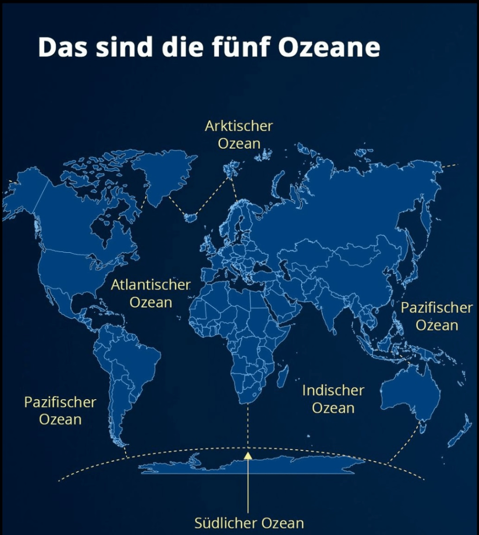 Lösung: Pazifik, Atlantik, Indischer Ozean, Südlicher Ozean, Arktischer Ozean