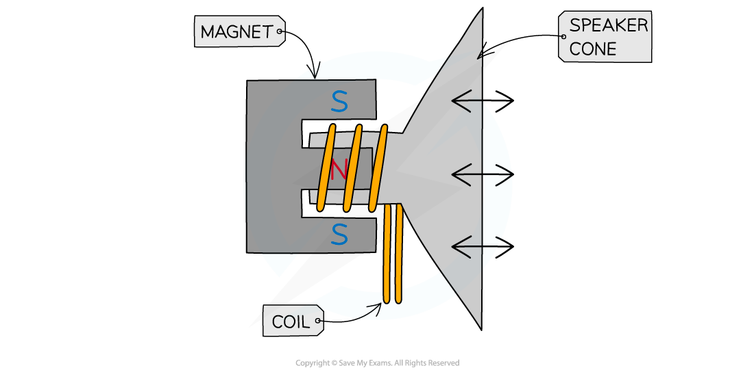 An alternating current flows through a coil of wire wrapped around a permanent magnet -> as the direciton of the current changes the direction of the magnetic field changes -> causes a change in the direction of the motor firce the wire experiences -> causes the coil of wire to oscillate back and forth -> causes the speaker cone attached tot he coil of wire to vibrate -> vibrations create sound waves