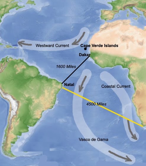 The shortest distance across the Atlantic Ocean (c. 1,600 mi/2,575 km) is between Senegal and Brazil's Northeast region.
