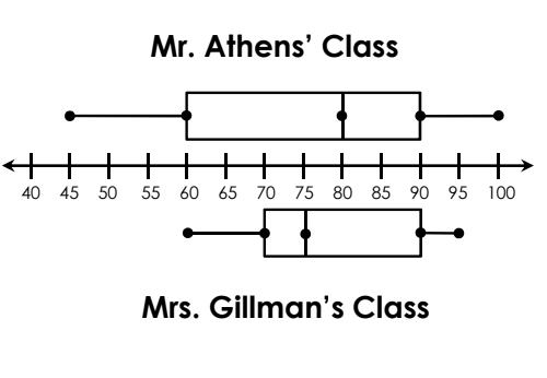 Mr. Athens and Mrs. Gilman gave the same test in their math classes. The scores of each class are shown below. Which class had the greater range of scores?