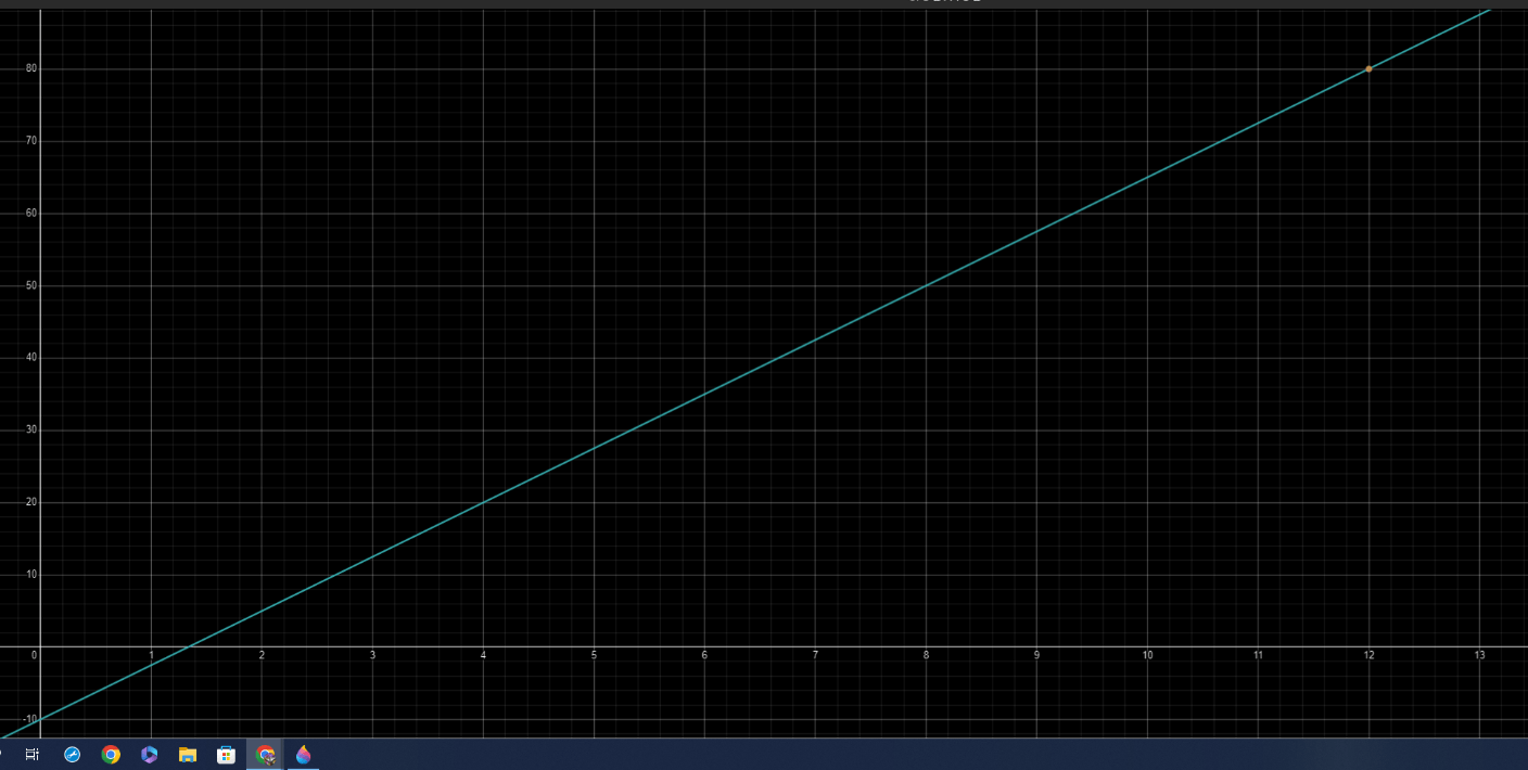 Suraj took a slice of pizza from the freezer and put it in the over. The overn heated the pizza at a rate of 7.5 degrees C per minute, and it reached the desired temperature of 80 degrees C after 12 minutes. This is the graph of the relationship between the pizza's temo and time.