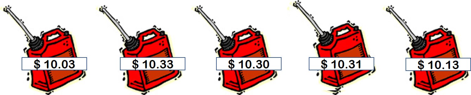Marcus needs to fill his gas can with gasoline from one of the 5 Decimal City gas stations.  The price it will cost at each gas station is shown below.