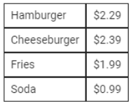 Aaron has $8.00. Does he have enough to buy a hamburger, a cheeseburger, fries, and a drink.