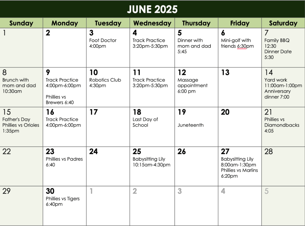 What happens first on the calendar, Brunch with Mom and Dad, or yard work?