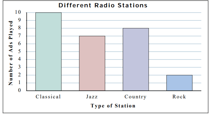 What is the difference in the number of ads played on the Rock station and the number played on the Jazz station?