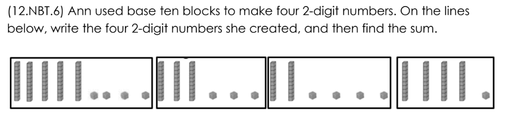 1. Selena used base ten blocks to make four 2-digit numbers. On the lines below, write the four 2-digit numbers she created, and then find the sum.