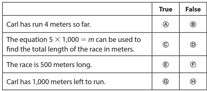 Carl runs in a 5 kilometer race. He has 1 kilometer left to run. Decide is each statement about the race is true or false. (1 kilometer = 1,000 meters)