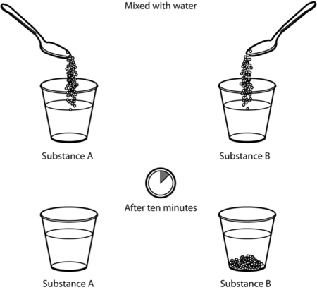 Substances A and B are both white crystals. A student stirs 5 grams of substance A into one container of water, and 5 grams of substance B into another container of water. After ten minutes none of substance A is visible in its container and all of the crystals of substance B can be seen on the bottom of its container. What is the most likely conclusion that can be drawn from these observations?