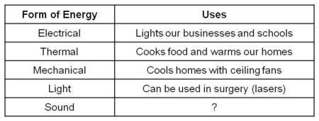 The table shows some different forms of energy and some ways they are used. Which of the following could be used to complete the table?