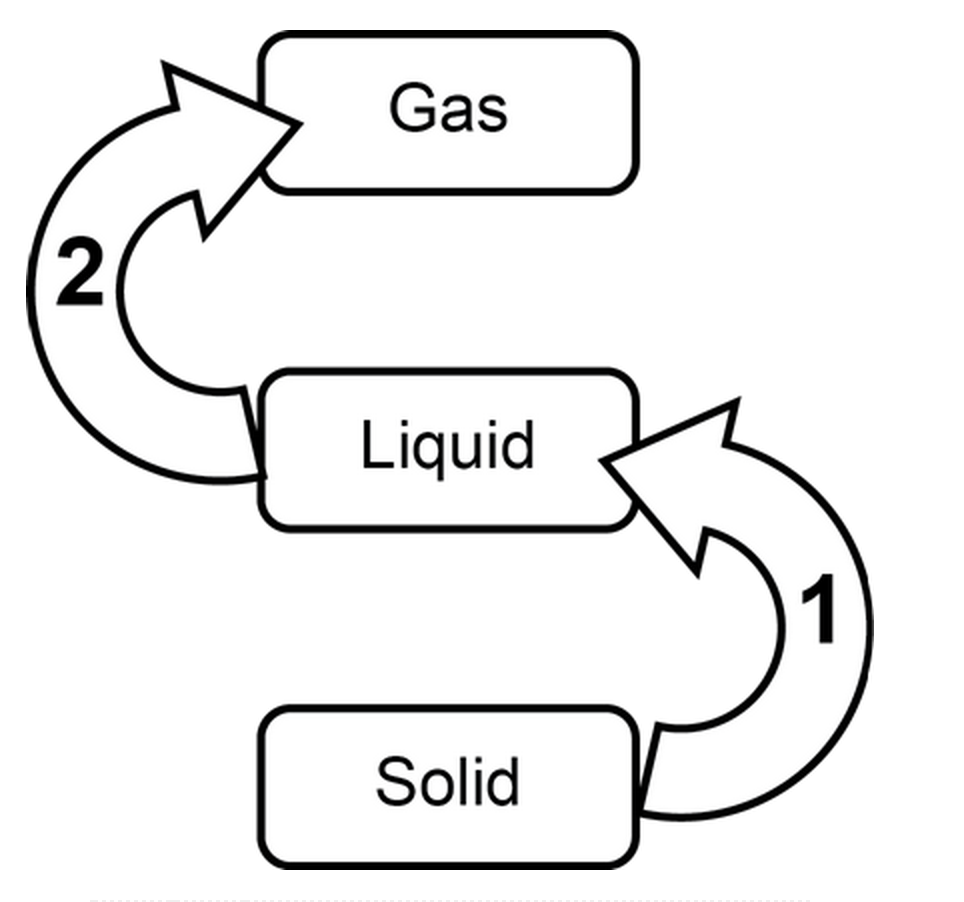 In the diagram below, what terms refer to the changes in state of matter indicated by arrow 1 and arrow 2?