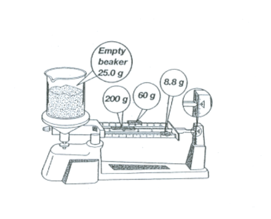 Find the mass of the sand that is inside the beaker in the picture below. Be sure you can read a triple beam balance (multiple questions on reading triple beam balance).