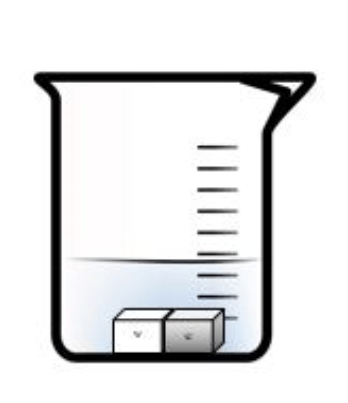 Draw a diagram with a beaker of liquid that has a density that allows both a piece of wood and steel to have a greater density than that of the liquid.