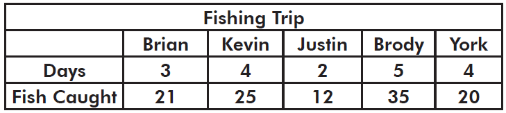 A number of friends went on fishing trips this summer. Each stayed a certain number of days and caught a certain number of fish during their trip. According to the table, whose ratio of fish caught per day is equivalent to Brian’s?