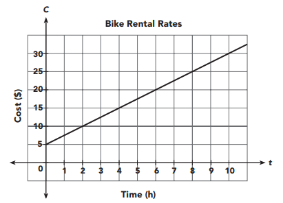 To rent a bike, Max pays a flat rate plus an hourly rental fee. The graph shows the amount, C dollars, he pays based on the number of hours, t, he uses the bike. What does the y-intercept represent?