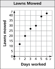 The scatter plot shows the numbers of lawns mowed by a local lawn care business during one week. How many days would it take to mow 30 lawns?