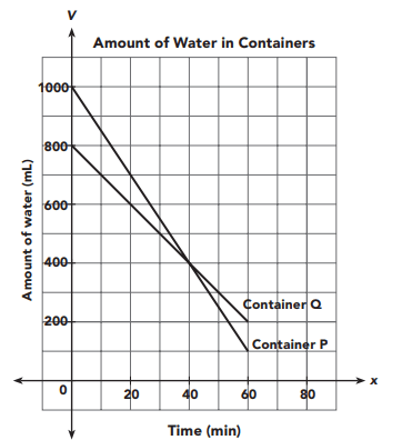 Two containers P and Q are filled with different amounts of water. Each container has a small hole. The graph shows the amount of water, V milliliters, left in each container after x minutes. Which container has a larger hole?