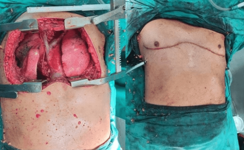 Clamshell thoracotomy (bilateral anterior thoracotomy).