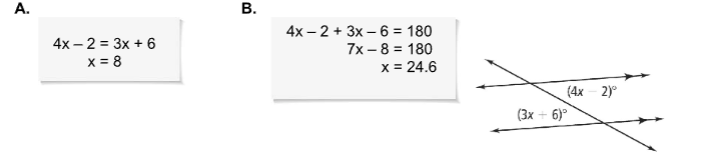 Answer B is incorrect because alternate interior angles are congrurent to each other, not supplementary.