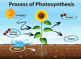 When sunlight, water, and air is combined together, sugar (food) is created to help the plant grow and survive.