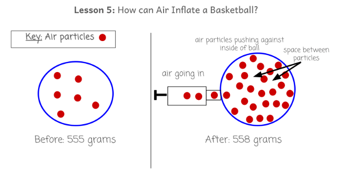 This happens because air is matter — it takes up space. As more air goes inside, the air particles push against the inside walls of the ball. The pressure from the air makes the ball expand and become firm.