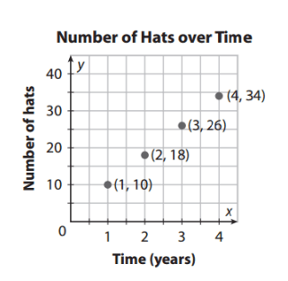 Shelby collects hats. The total number of hats Shelby collects depends on how many years she has been collecting hats. After the first year, Shelby has collected 10 hats. Each year she has added the same number of hats to her collection. The graph shows the sequence.