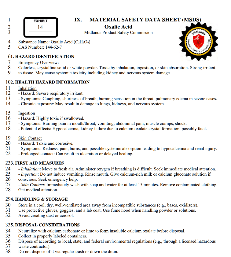 Exhibit 14 Material Data Safety Sheet for Oxalic Acid