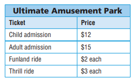 Which expression shows the cost of one adult admission ticket and 9 thrill ride tickets?