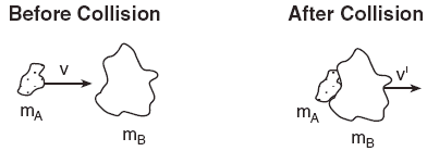 The diagram below represents two masses before and after they collide. Before the collision, mass mA is moving to the right with speed v, and mass mB is at rest. Upon collision, the two masses stick together.