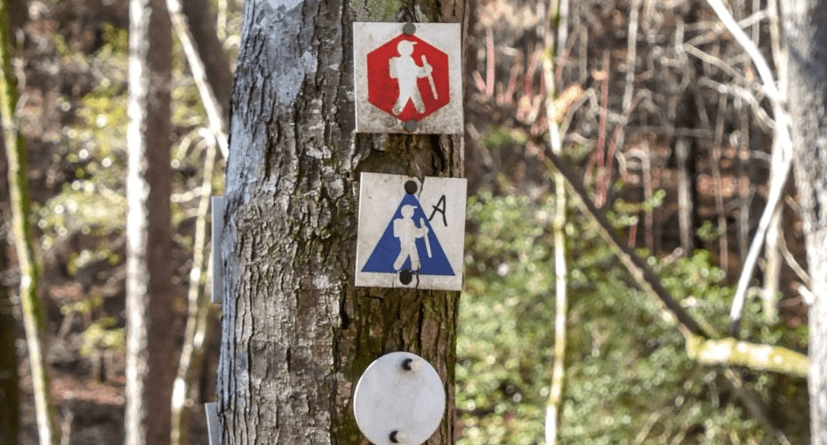 These small signs are attached to trees or fences to provide directions along a hiking trail.