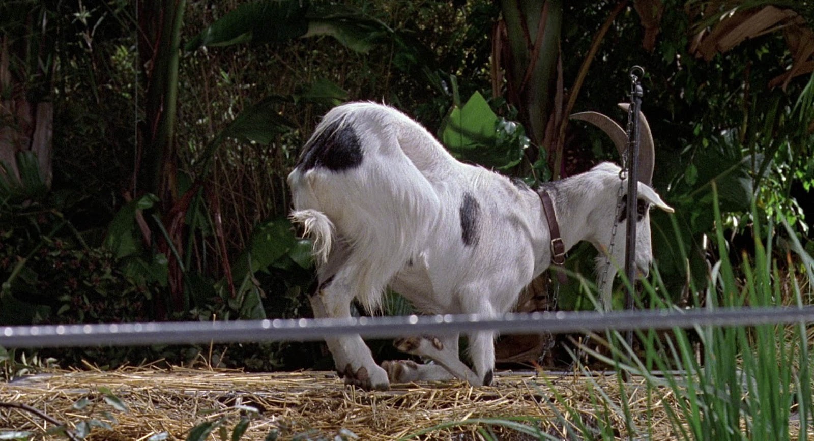 In "Jurassic Park", to what movie does Ian Malcolm make a reference outside the park gates?