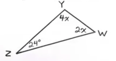 Find the values of the missing interior angles in this triangle. Remember, the sum of the angles in a triangle add up to 180o.