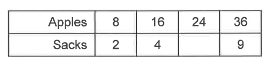 The table shows the number of sacks that are needed to package different numbers of apples. What is the rule of this table? How many sacks will be needed to package 24 apples?