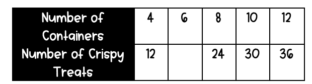 Mrs. Carvajal made a chart to show the number of Crispy Treats she put into different numbers of containers. Each container held the same number of Crispy Treats. How many Crispy Treats would be in 6 containers?