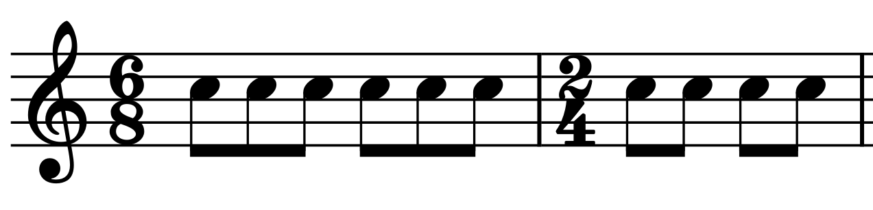To keep the pulse the same as the time signature changes, what sign do I need to put above the 2/4 measure? (Hint: ____ = ____)